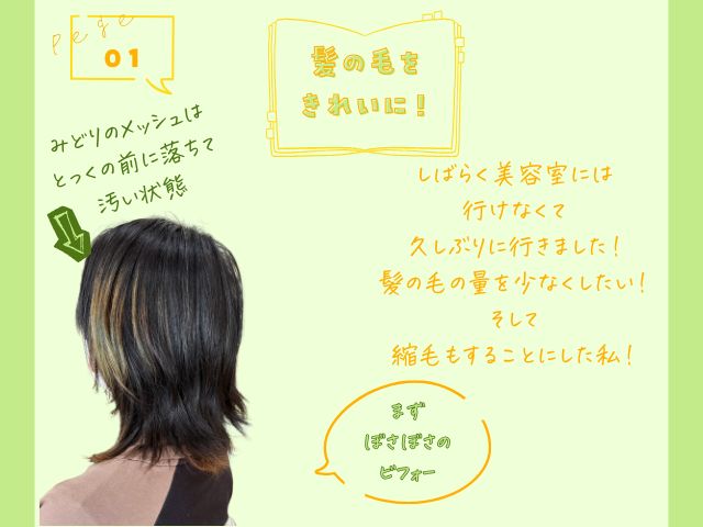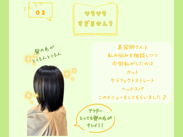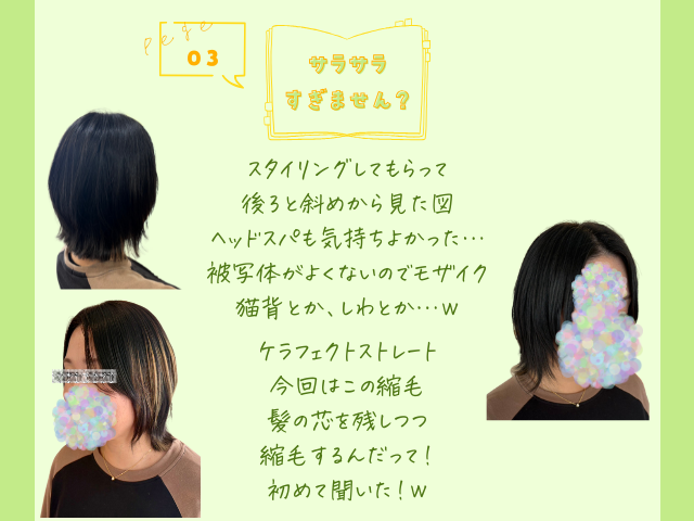 私が今回お願いした内容はカット・縮毛・ヘッドスパでした!